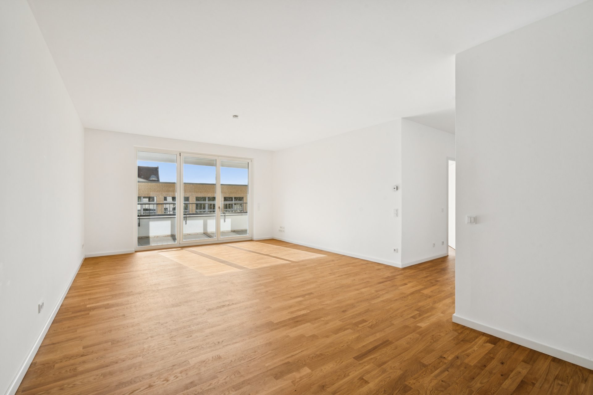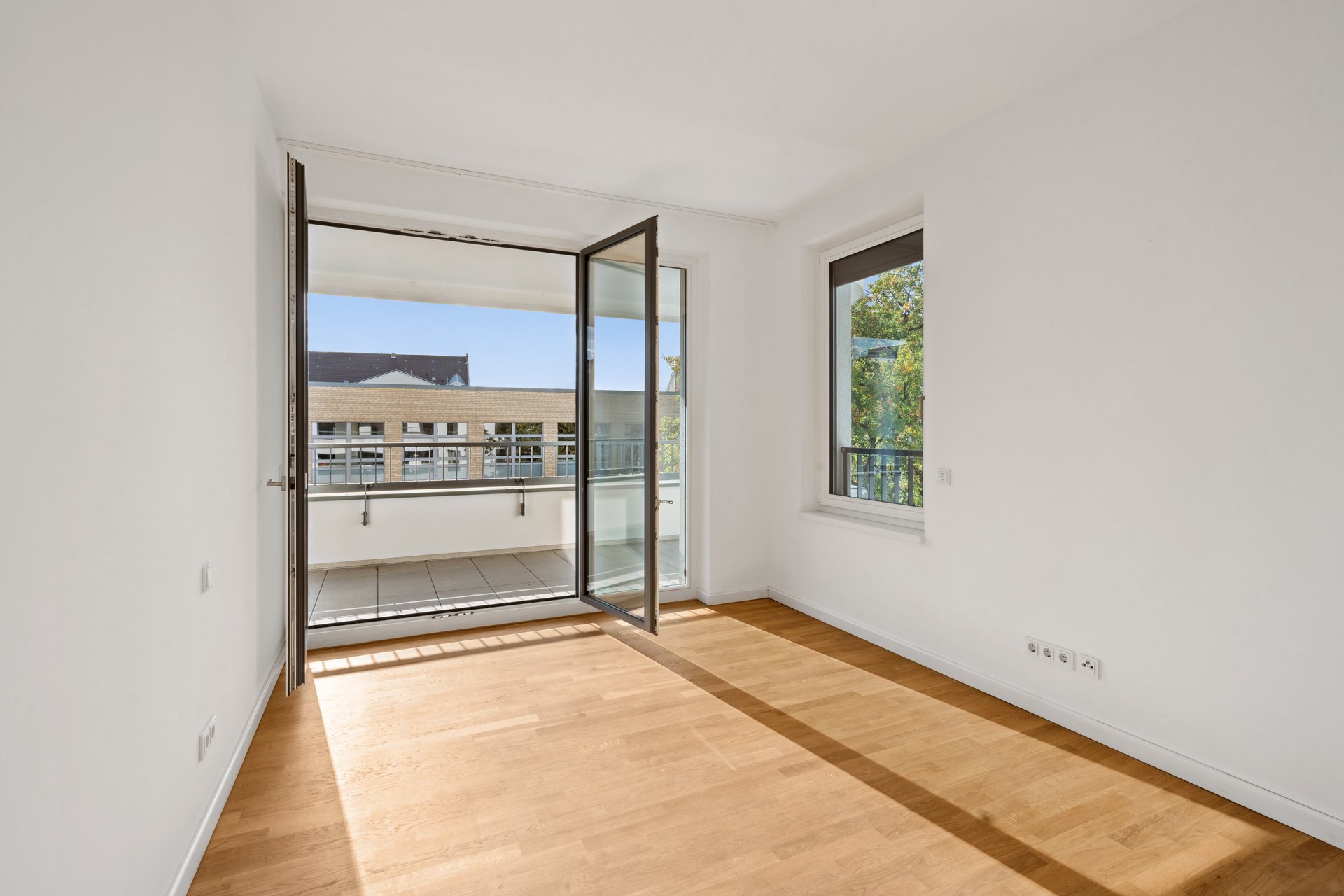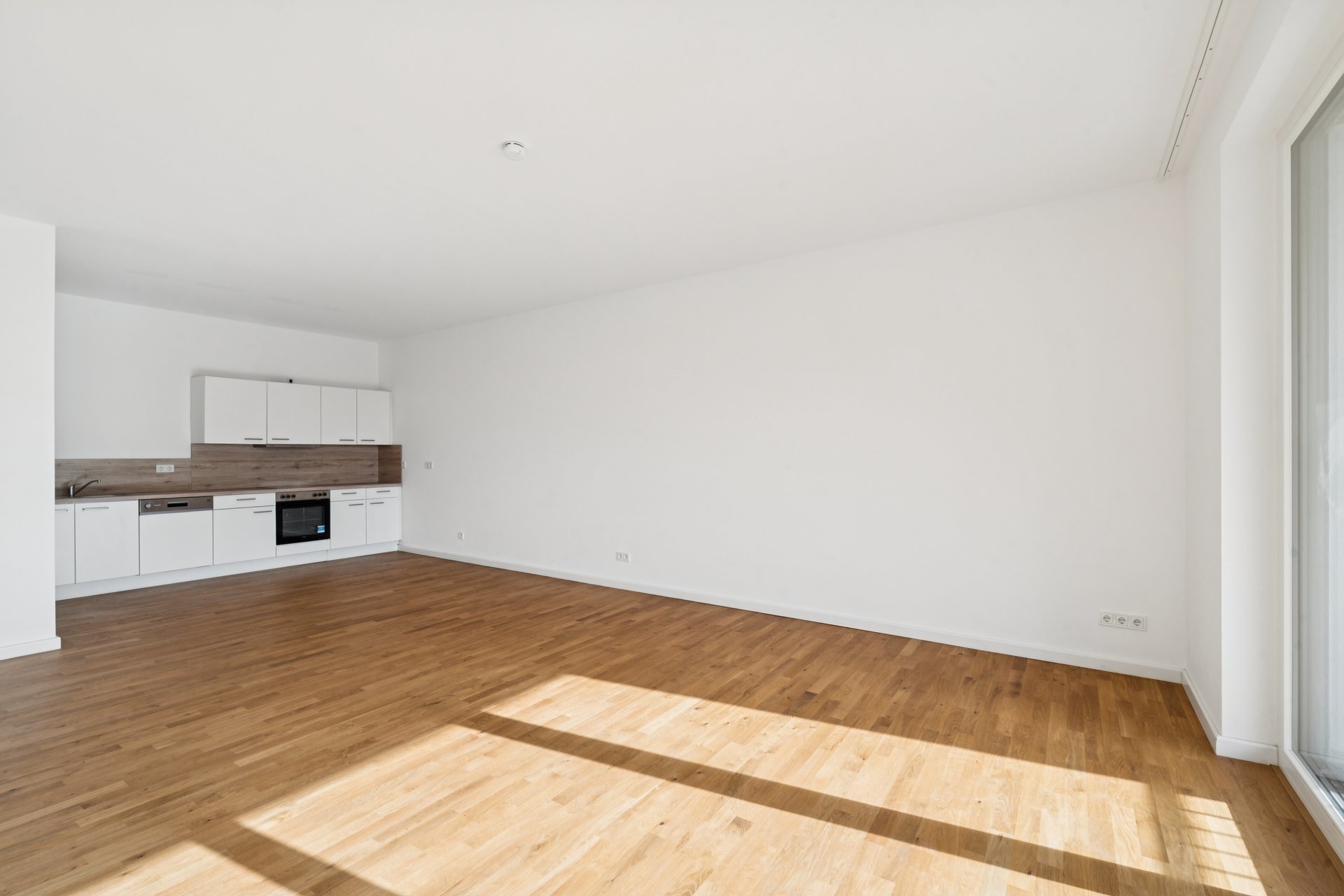 Der lichtdurchflutete Wohn- und Essbereich mit offener Küche schafft ein großzügiges Raumgefühl und maximale Flexibilität in der Gestaltung. Bodentiefe Fenster verbinden Innen- und Außenbereich harmonisch und führen auf den sonnigen Balkon mit Blick in den begrünten Innenhof – ein idealer Ort für entspannte Stunden.