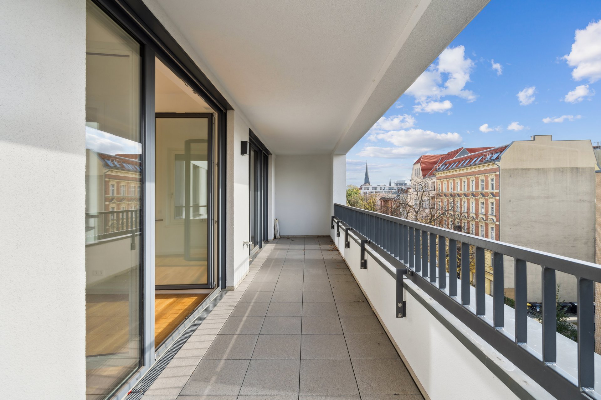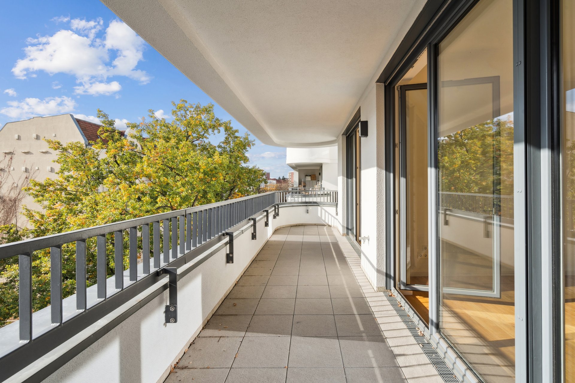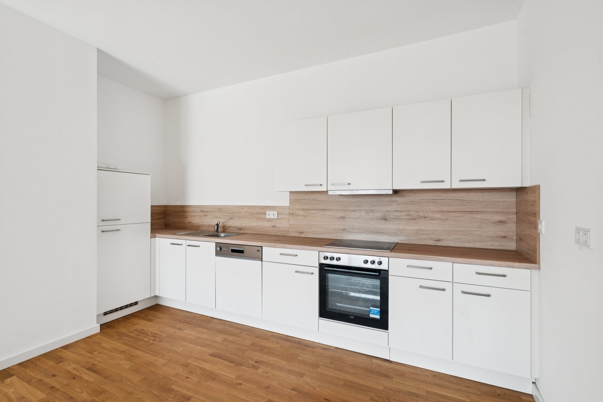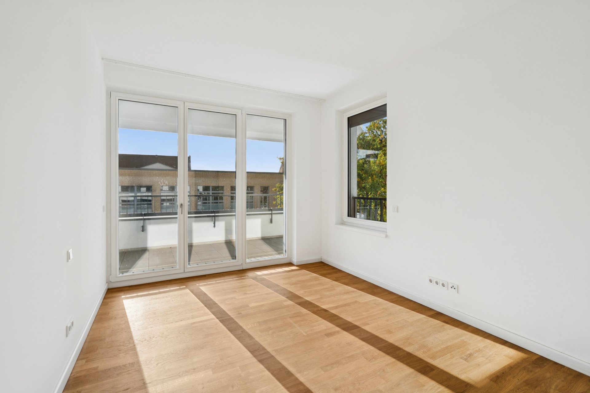 Der lichtdurchflutete Wohn- und Essbereich mit offener Küche schafft ein großzügiges Raumgefühl und maximale Flexibilität in der Gestaltung. Bodentiefe Fenster verbinden Innen- und Außenbereich harmonisch und führen auf den sonnigen Balkon mit Blick in den begrünten Innenhof – ein idealer Ort für entspannte Stunden.