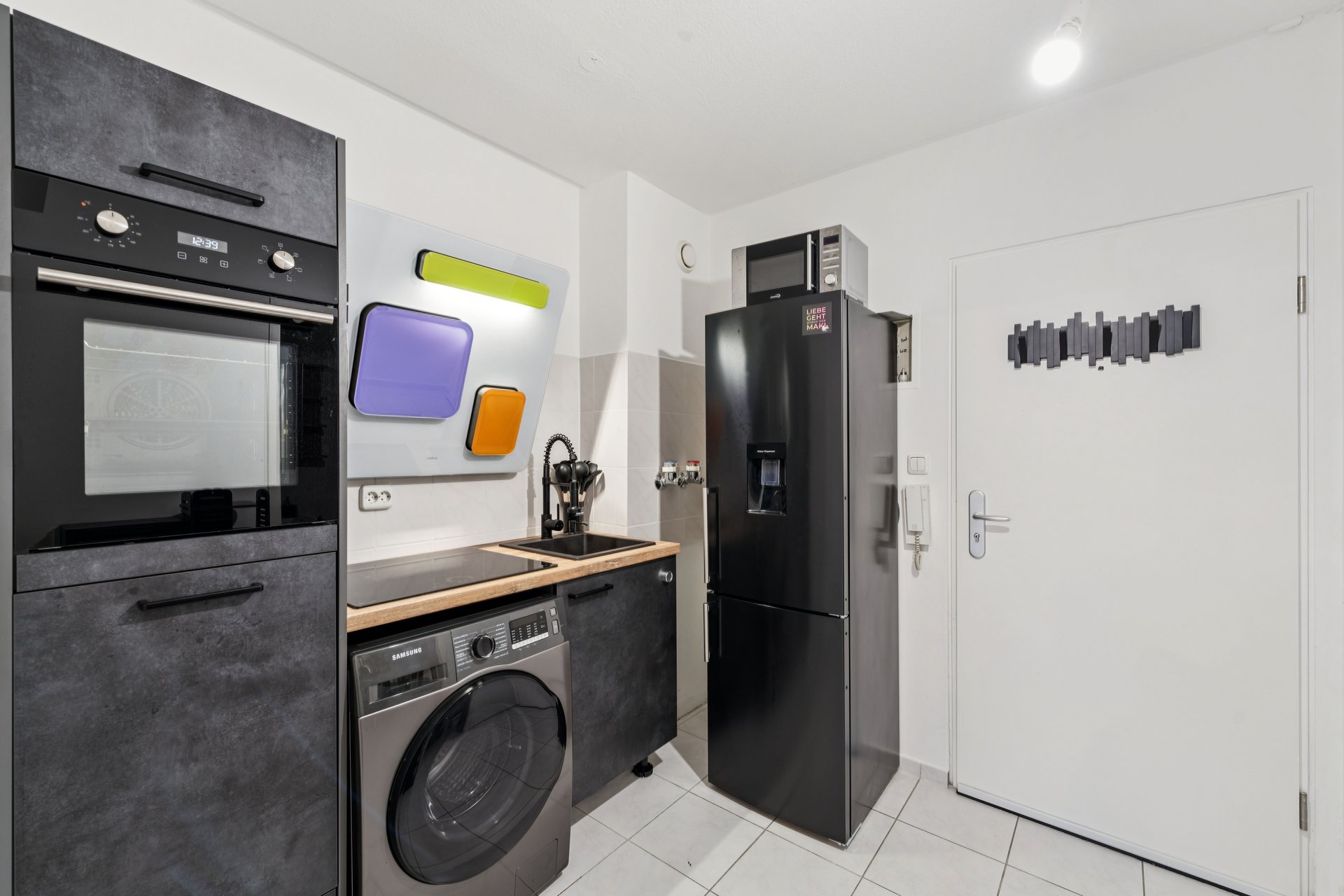 Die voll ausgestattete Einbauküche überzeugt nicht nur optisch, sondern auch funktional. Ein leistungsstarker, hochwertiger Dunstabzug sorgt dafür, dass selbst bei intensiver Nutzung stets ein angenehmes Raumklima erhalten bleibt – ideal für ein stilvolles City-Apartment. Besonders intelligent integriert ist die aufklappbare Schlafmöglichkeit: Das Bett verschwindet elegant vollständig im Schrank und verwandelt den Wohnraum tagsüber in eine großzügige, offene Fläche.
