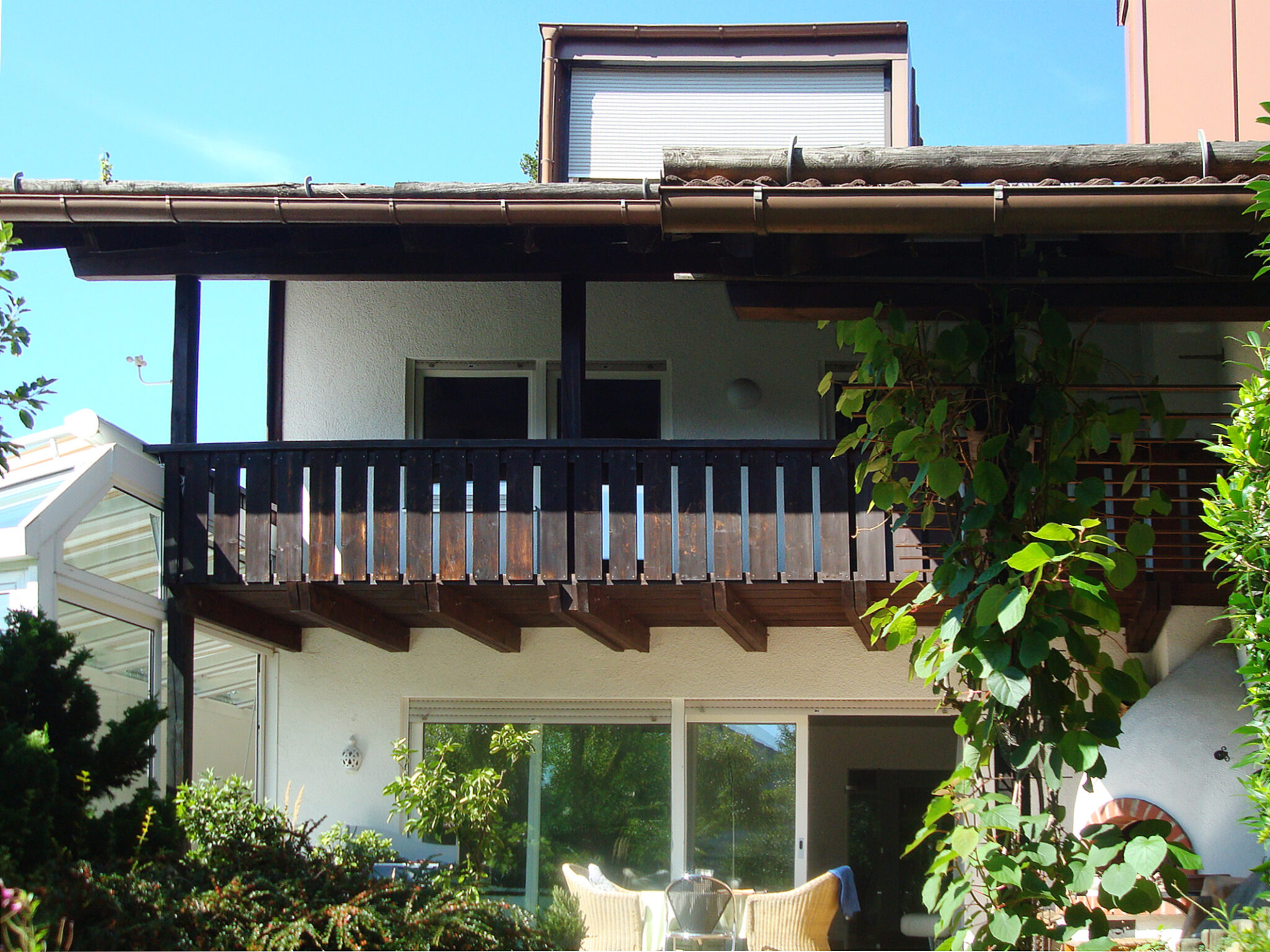 Die Terrasse wurde mit einer aufschiebbaren Fensterfront versehen, die einen nahtlosen Übergang zwischen Innen- und Außenbereich ermöglicht. Im ersten Obergeschoss erwartet Sie echtes Buchenparkett, während das Dachgeschoss mit modernem Laminat ausgestattet ist.